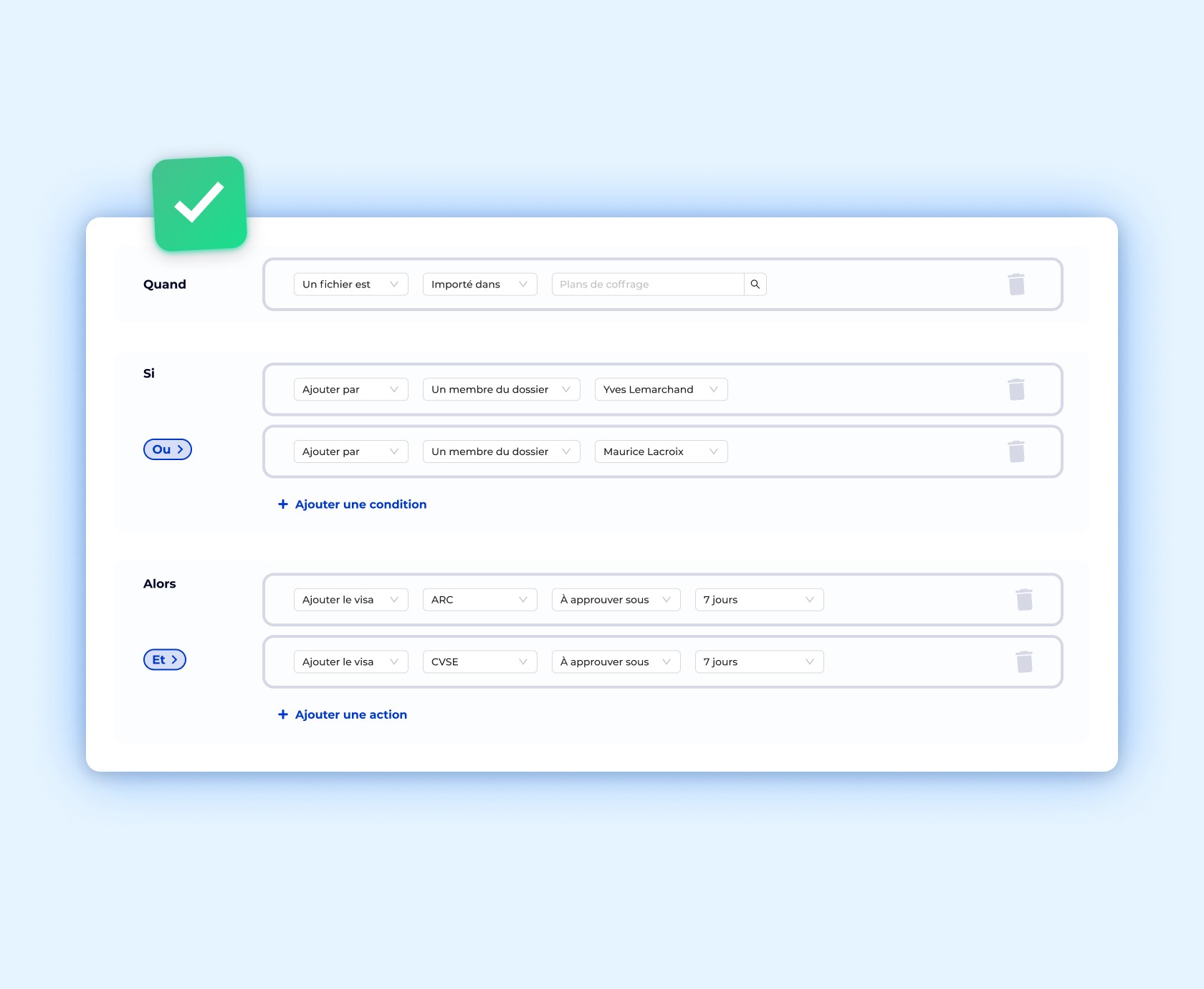 Définissez des règles pour chaque dossier : Exemple : “Tous les plans de coffrage doivent être validés sous 7 jours par l’Architecte et l’Ingénieur CVSE”